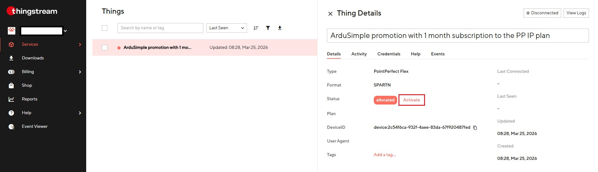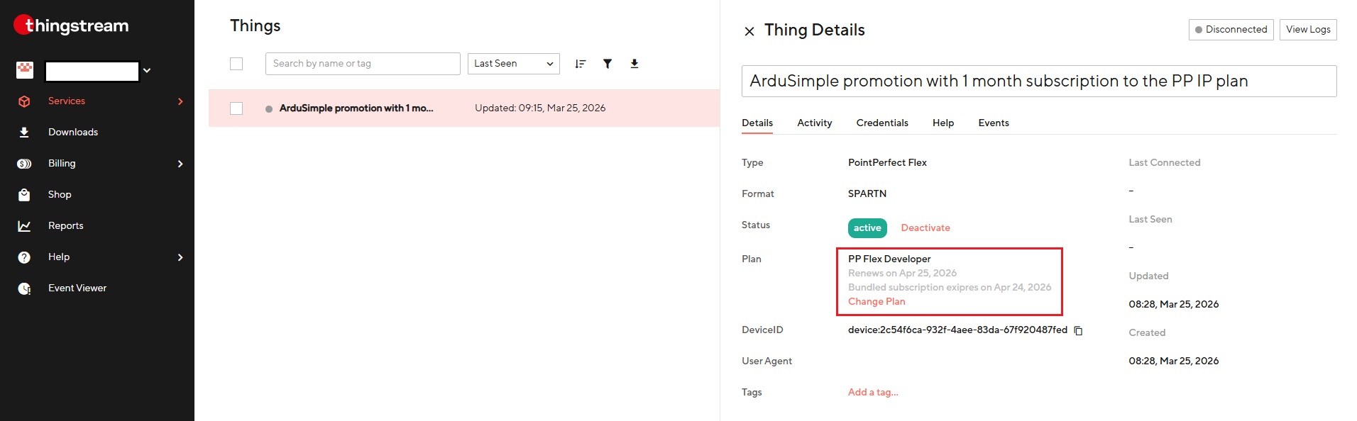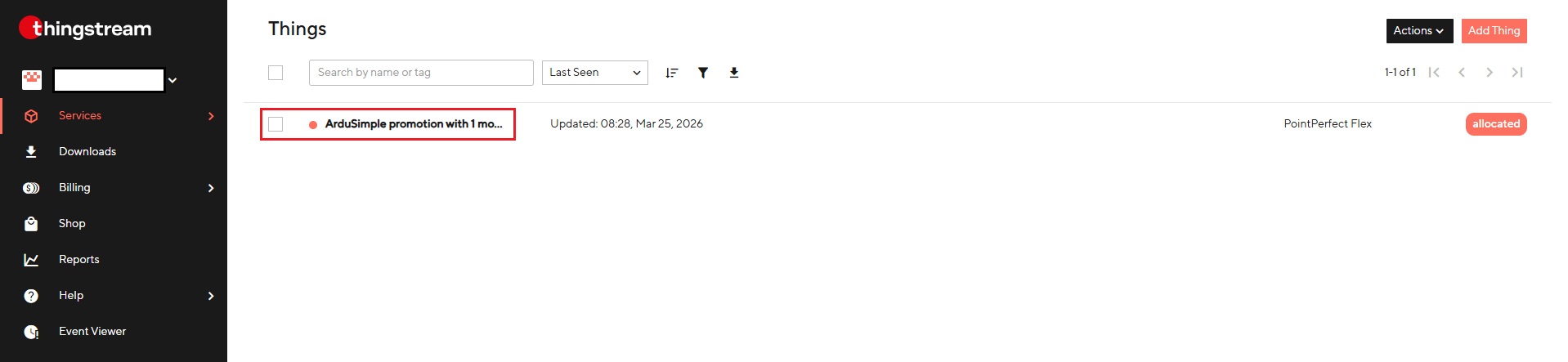 - Ako ste koristili besplatnu 30-dnevnu probnu verziju PointPerfecta, nova PointPerfect stvar je automatski kreirana za vas unutar Thingstream platforme. Odaberite stvar pod nazivom Ardusimple promocija uz 1-mjesečnu pretplatu na PP IP plan.