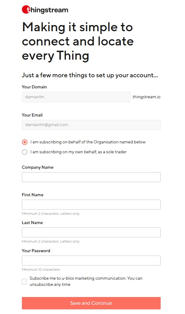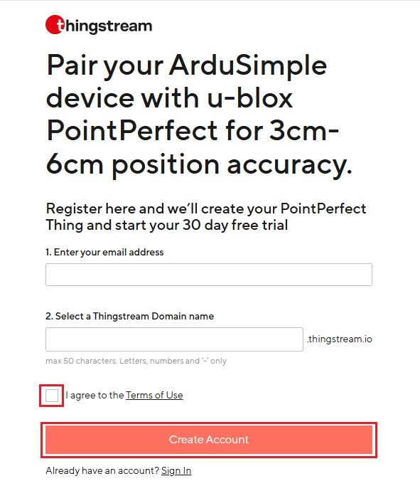 - The u-blox Platforma Thingstream je također način za stvaranje PointPerfect Live račun, ali da biste imali pristup probnom razdoblju morat ćete izravno kontaktirati u-blox služba za korisnike.