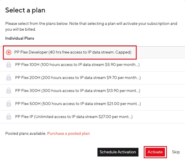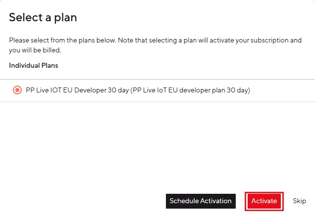 - Odaberite PP Live IOT plan za razvojne programere koji nudi 40 sati besplatnog korištenja tijekom jednomjesečnog probnog razdoblja. Pritisnite Aktivirati.