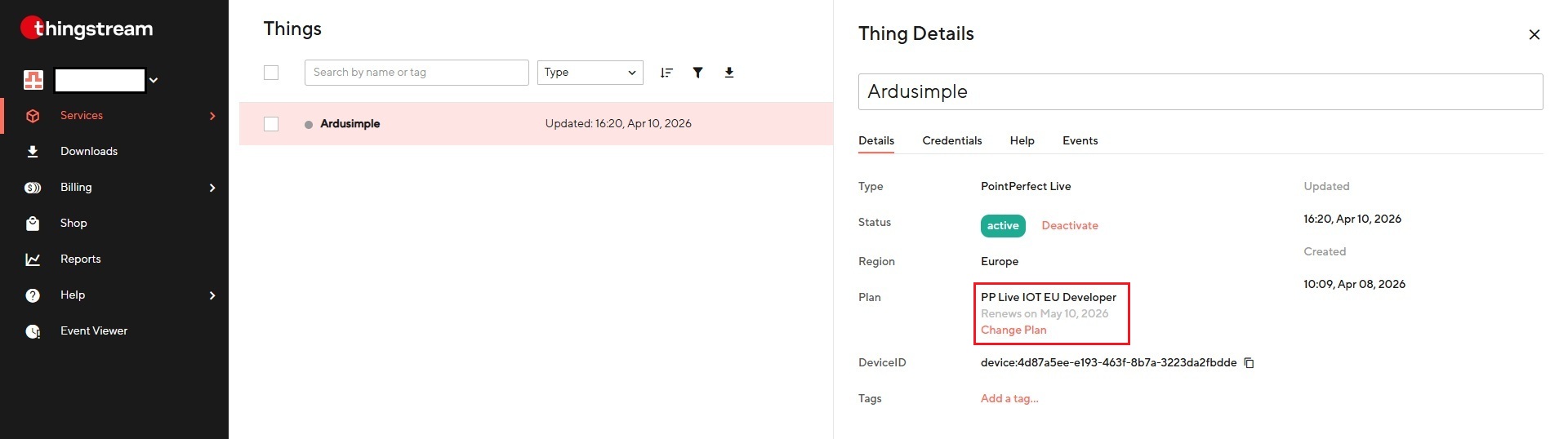 - Nakon korištenja Ardusimple 30-dnevni besplatni probni vaučer za novu PointPerfect stvar (koja će predstavljati vašu GNSS uređaj) je automatski kreiran za vas unutar platforme Thingstream. Idite na Usluge > Popis stvari.