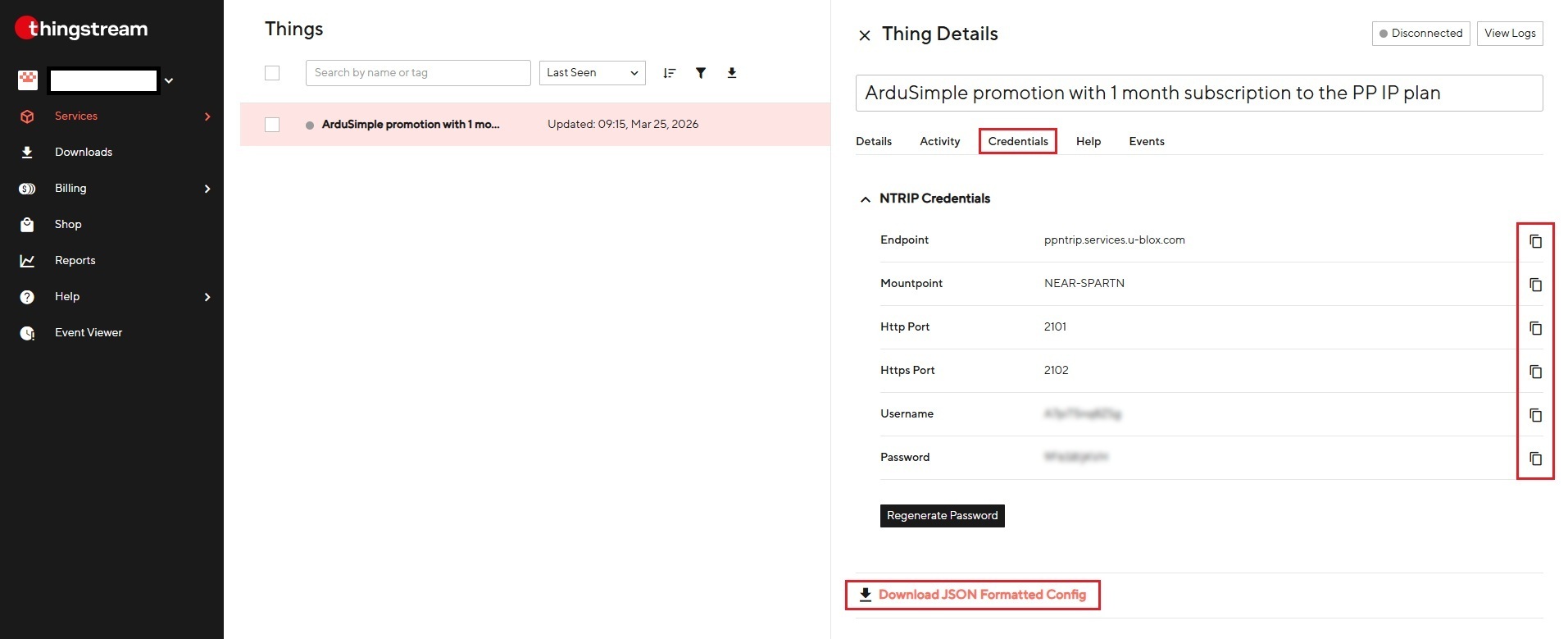 - Za unos ispravaka na uređaj povezan s PointPerfect Flex ili Live Thing, trebali biste prikupiti njegov NTRIP Vjerodajnice koje će se naknadno koristiti od strane NTRIP klijent. Idi na Kartica VjerodajnicePrikazano NTRIP Prikazani su podaci za prijavu (poslužitelj, port, korisničko ime, lozinka, točka montiranja) za vaš PointPerfect Thing uređaj. Preuzmite JSON formatiranu konfiguraciju ili kopirajte vjerodajnice, jer će vam trebati kasnije u vašem NTRIP kupac.