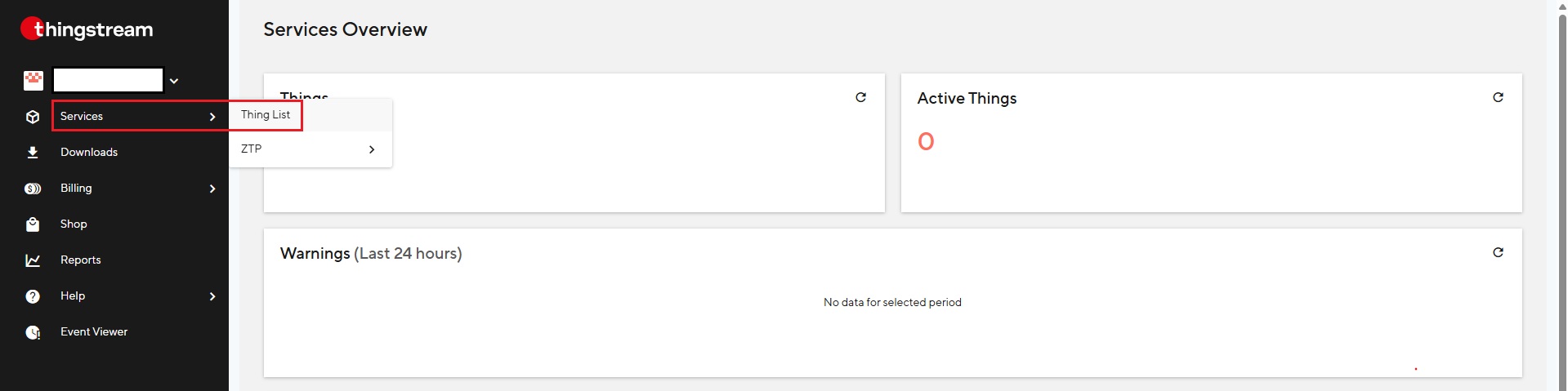 - Nakon što vam Thingstream račun bude aktiviran od strane u-blox moći ćete pristupiti platformi i stvoriti PointPerfect Live Thing. Idite na Usluge > Popis stvari.